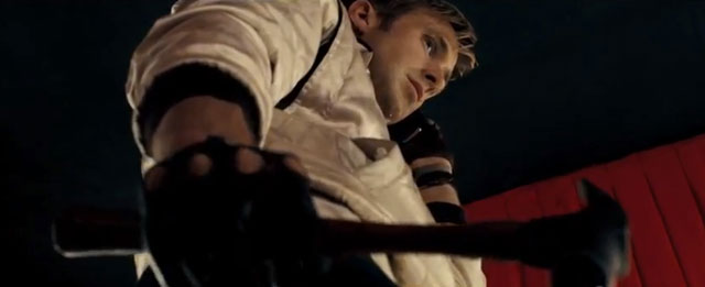 At two points in the film, Driver gets blood on him, like he was doused with it. When he doesn’t wear his trademark jacket, he wears a blue denim jacket. Still blue, yes. However, it’s a dark blue; almost black. During this scene, he kills two gangsters with a shotgun and is covered with blood. This happens again late in the film, Driver gets blood on his white jacket that doesn’t come off for the rest of the film, and this is possibly showing Driver’s true colors: he was never a real protagonist. Driver was never interested in killing or money, his love of cars and his ability to drive led him into this life and he couldn’t escape.